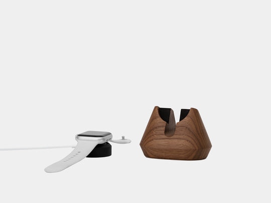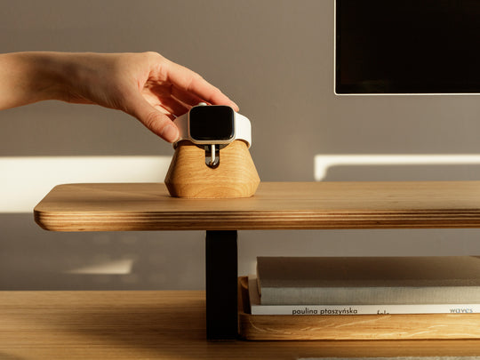 Ein Holzfuß mit niedrigem Schwerpunkt sorgt für Stabilität und bietet optimalen Halt für die zu ladende Apple Watch.