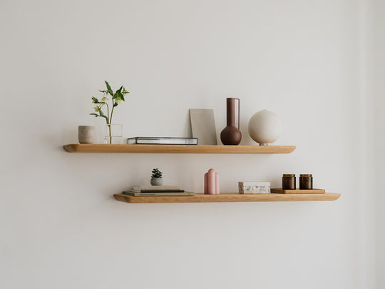 Półka z litego drewna została zaprojektowana w taki sposób, by tworzyła spójną kompozycję z biurkiem: jej brzegi są wykończone naszym oryginalnym frezem, który dodaje jej lekkości.